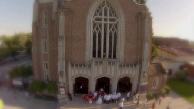 Birds eye view above McLeod Lake towards the iconic shade structure of the Weber Point Event Center in Stockton, California. View Video Here